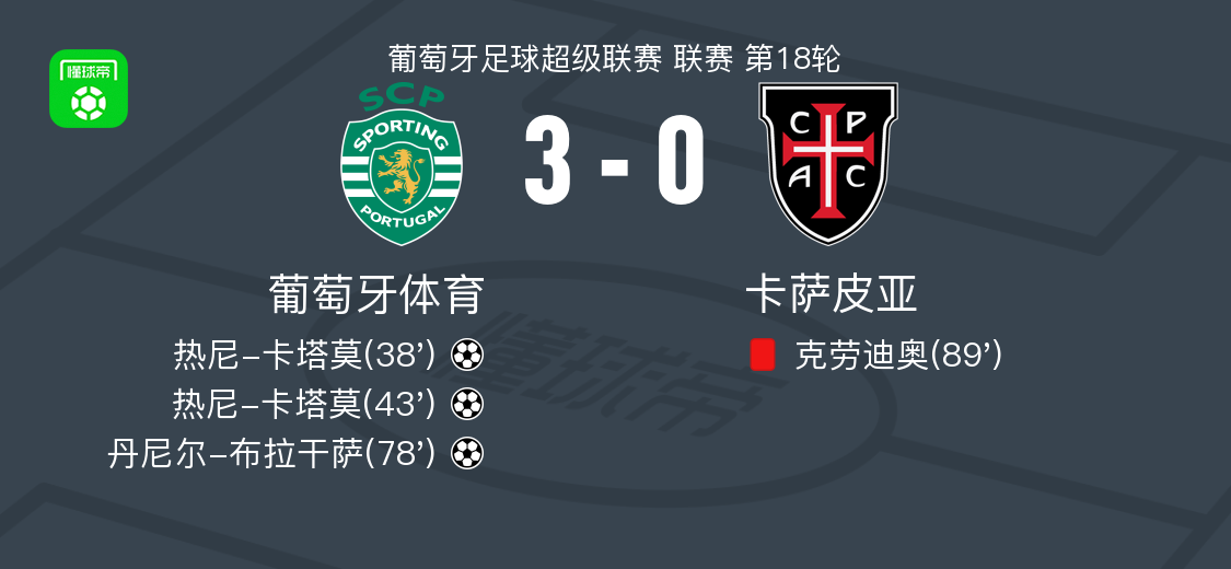 北京时间1月17日葡萄牙足球超级联赛 联赛 第18轮,葡萄牙体育主场对阵卡萨皮亚。葡萄牙体育热尼-卡塔莫梅开二度,丹尼尔-布拉干萨破门。最终比分葡萄牙体育 3-0 卡萨皮亚。